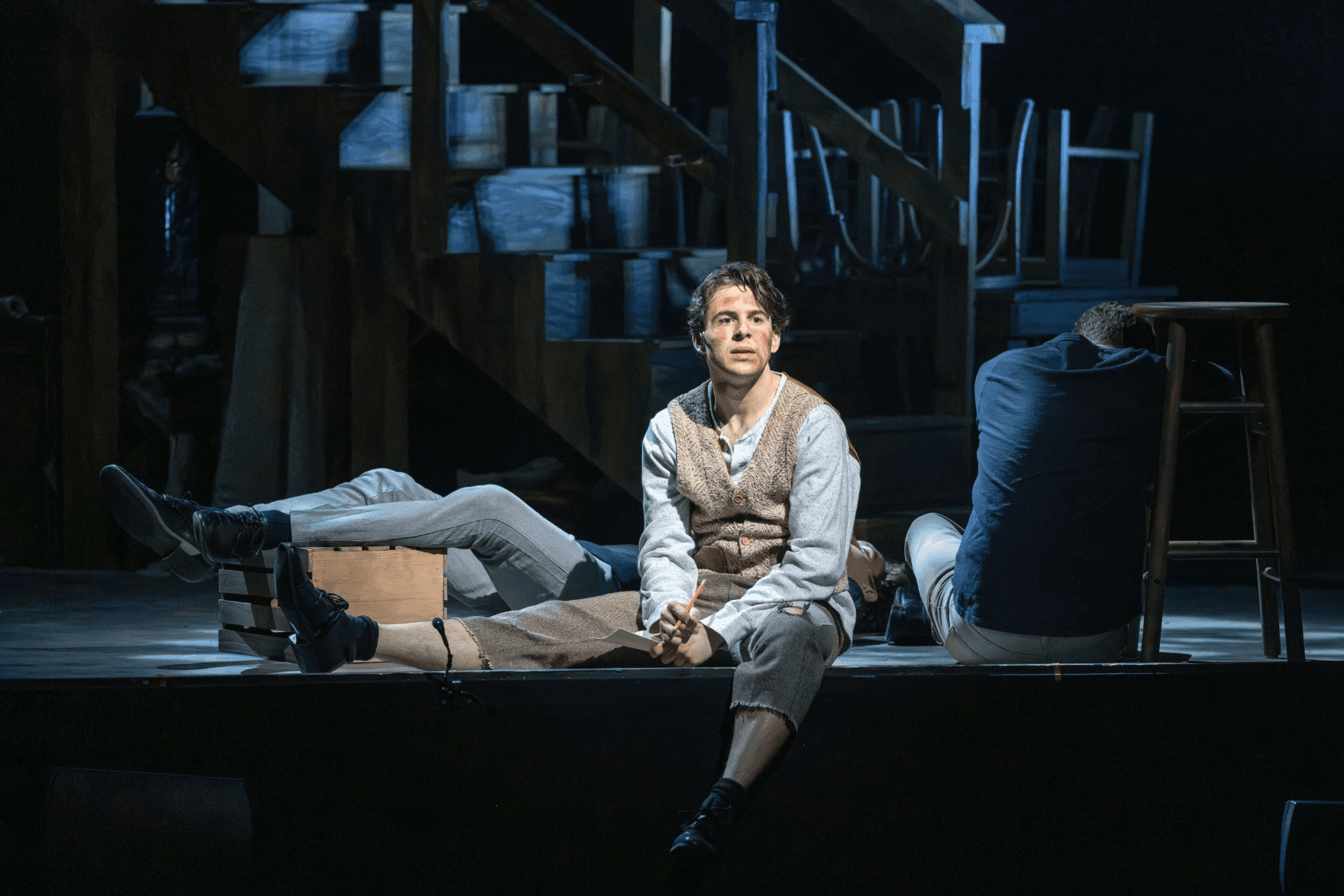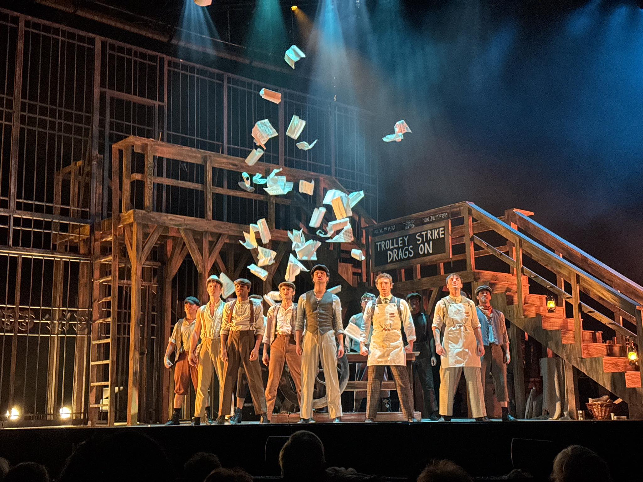 "Victorious in accomplishing a nuanced and stunning creation of this world was Scenic Designer, Christian Fleming. With a floor-to-ceiling gate and a daunting staircase, Fleming’s canvas of a place where overreach is the default was apparent and cast members were able to further that visualization with their staggered steps and pounding on the metal that both protected their enemies and decided when the newsboys were allowed to take their crumbs." - Broadwayworld